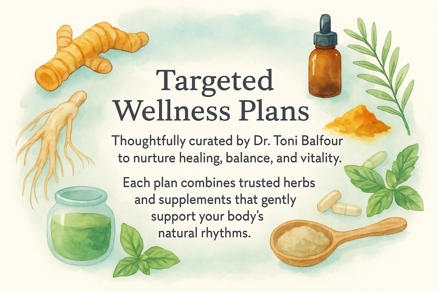 Curated by Dr. Toni Balfour, these wellness plans offer gentle, targeted support for healing, balance, and daily vitality.